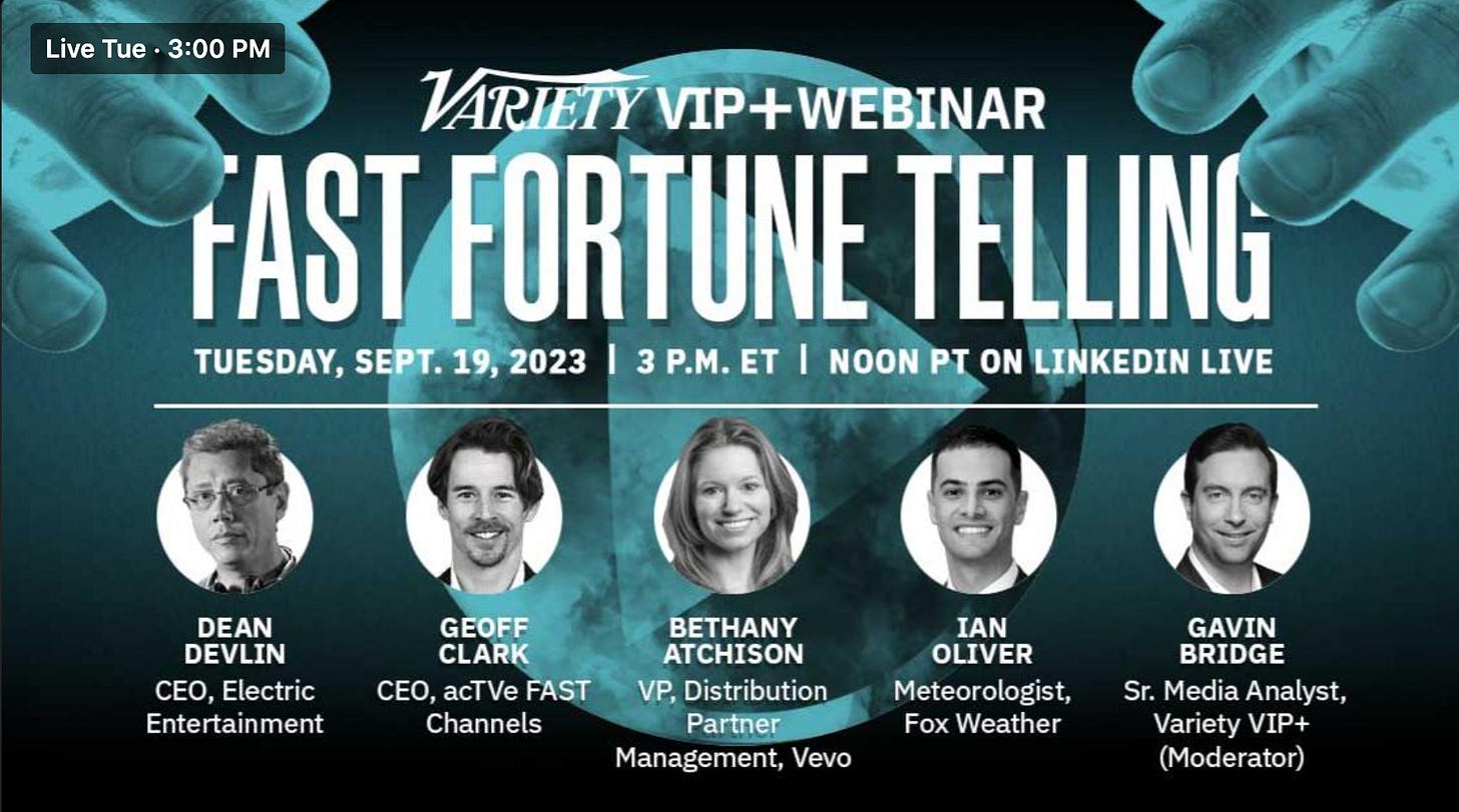 It’s on LinkedIn Tuesday 9/19 at 3pm Eastern and we’re going to be covering the innovations that FAST is seeing and what to expect in the near future. And I promise that any stats cited will be accurate (as you can tell, the bad data floating around in FAST is quite distressing).