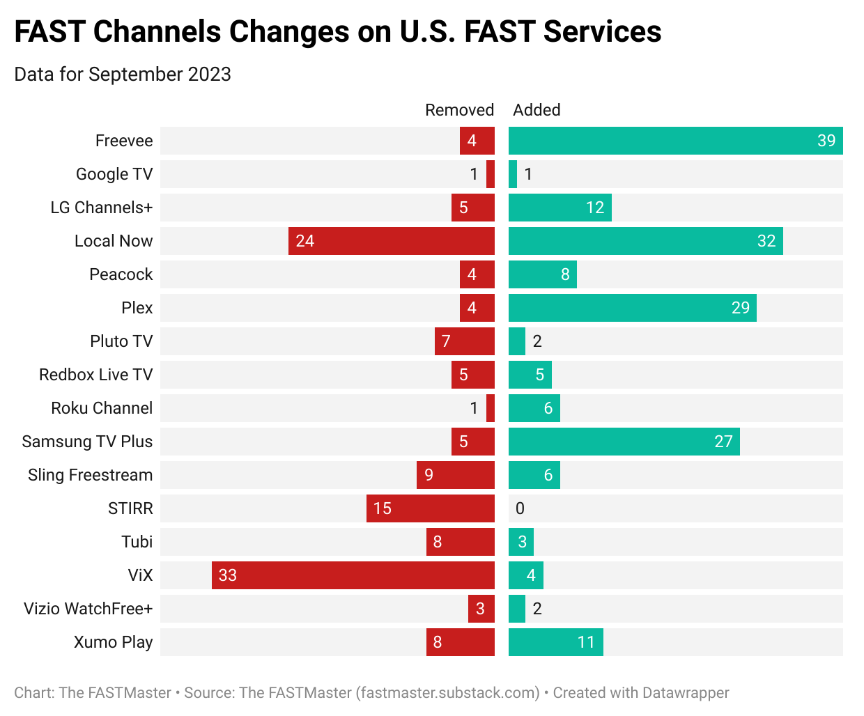 I saw recently someone publishing contextless data around channel attrition/growth. I’ll take that challenge. Here’s the addition/removal figures for the major U.S. services between August and September. Freevee, Local Now, Plex and Samsung TV Plus saw big additions. Vix actually cut a lot of channels, which was part of a trend seeing channels carried by one or two services being cut.