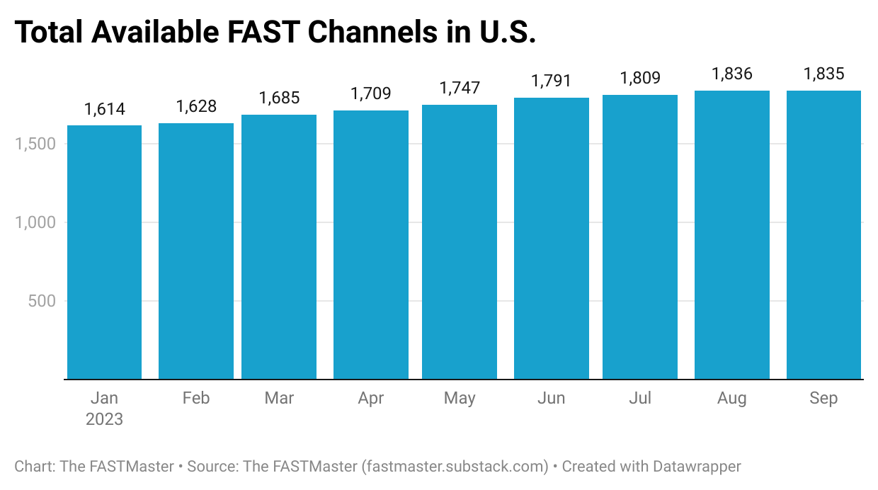 This lead to a shocking finding! The total number of available FAST channels dropped in September. Okay, only by one channel. Don’t worry, the FAST boom isn’t over. It means that smaller channels that were distributed on one or two smaller platforms are now being removed, as the brandification continues. 1,835 total channels is still an immense figure, up from the 1,464 seen last September.