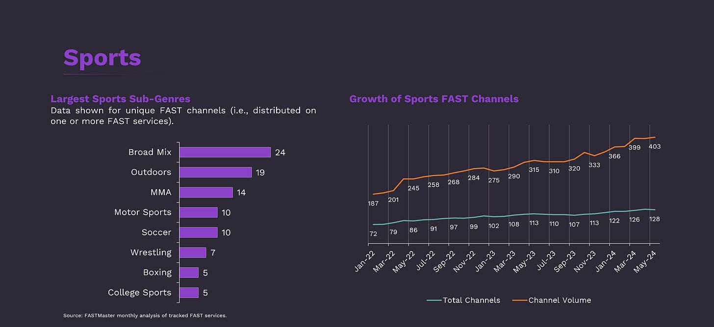 The new report also breaks out channel trends by genre, with Sports above illustrating what’s available for the five overarching FAST genres: General Entertainment, Movies, Music, News and the aforementioned Sports.