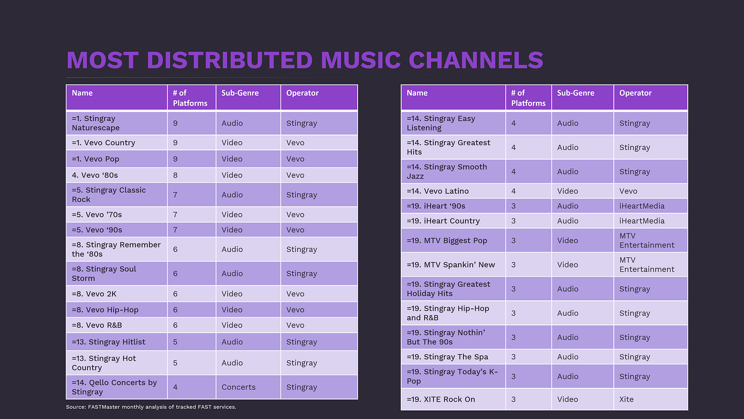 Given how much everyone seemed to love those most-distributed channel lists, I threw them in by genres too. As can be seen from the music example above, Stingray and Vevo have music locked down for audio and video distribution respectively.
